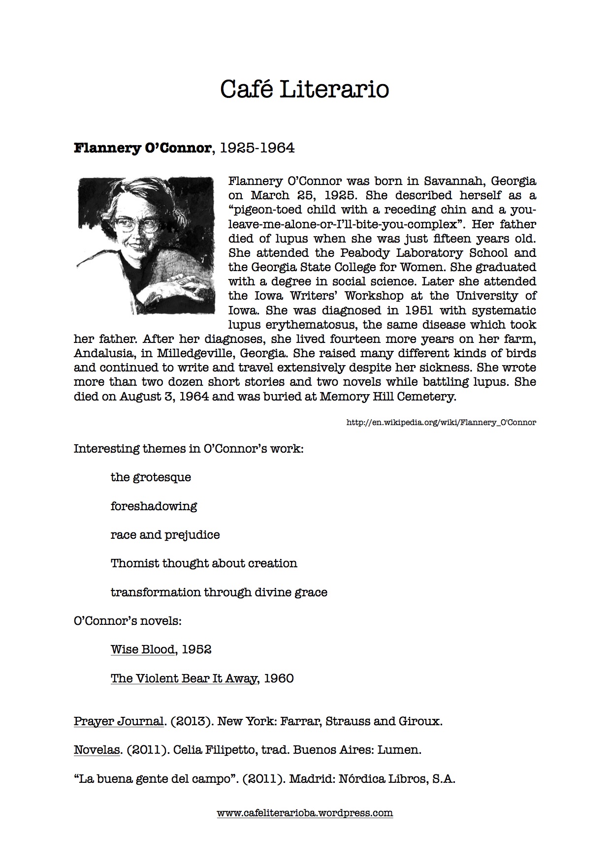 This past Thursday we learned about the great American author, Flannery O’Connor. We read her short stories «The Artificial Nigger», «Good Country People», «Revelation» and «Judgment Day». Here’s the handout we shared with the group: