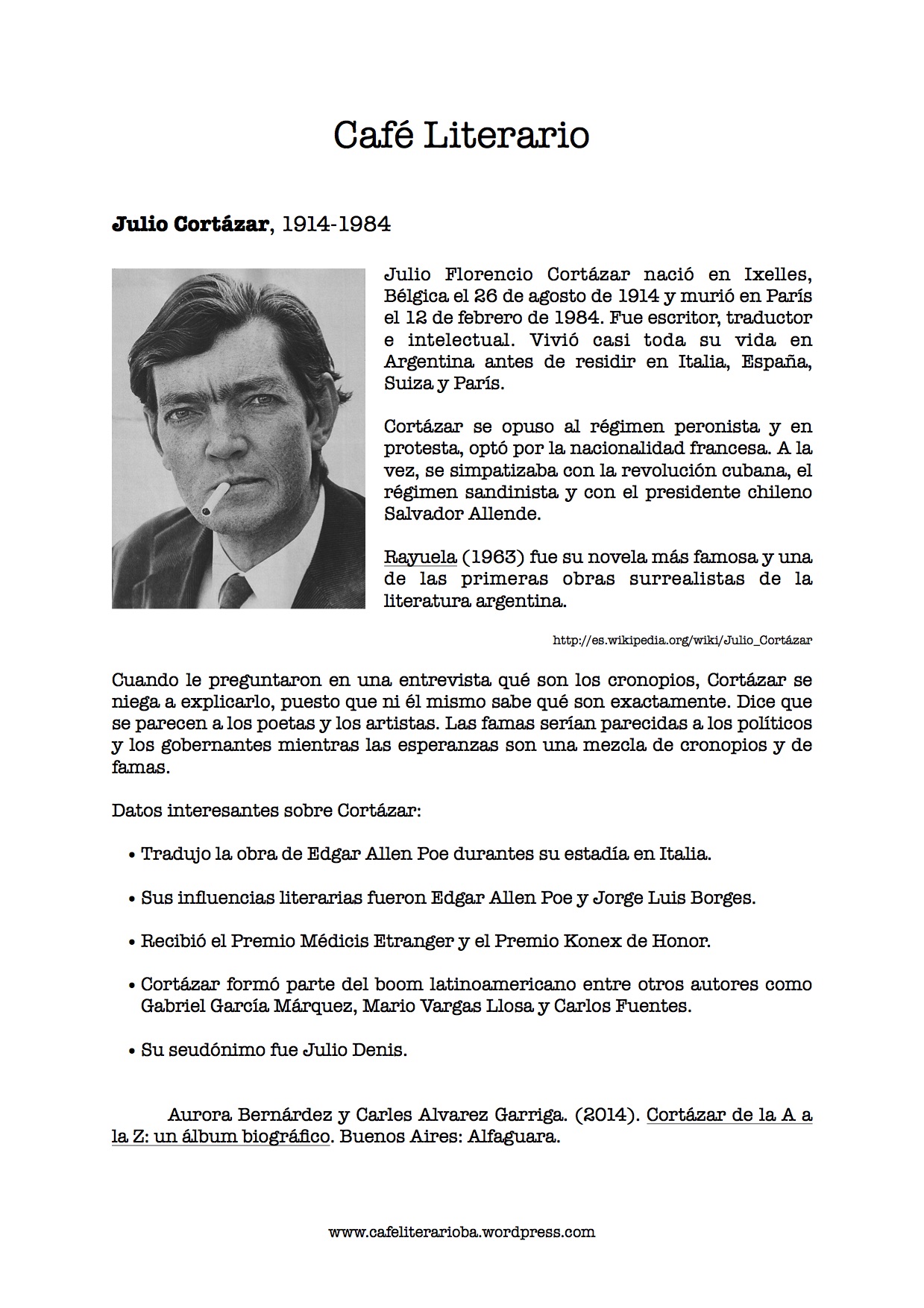 Julio Cortázar es conocido por su obra maestra Rayuela. También es conocido por su cuentos. Cortázar confesó que le daba más gusto escribir cuentos porque las novelas eran muy predecibles. Prefería escribir cuentos porque no sabía cómo iba a terminar el cuento hasta que lo haya terminado. Algunos de sus cuentos más cortos y más llamativos son las Historias de cronopios y de famas. Cortázar las quiso publicar solo pero sabía que tendría que también entregar otros cuentos para completar el tomo. Rebuscó unos cuentos en sus cajones y luego entregó el proyecto a su editorial.